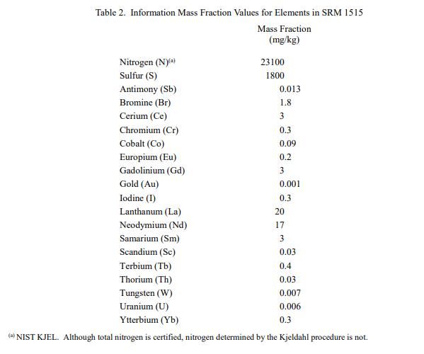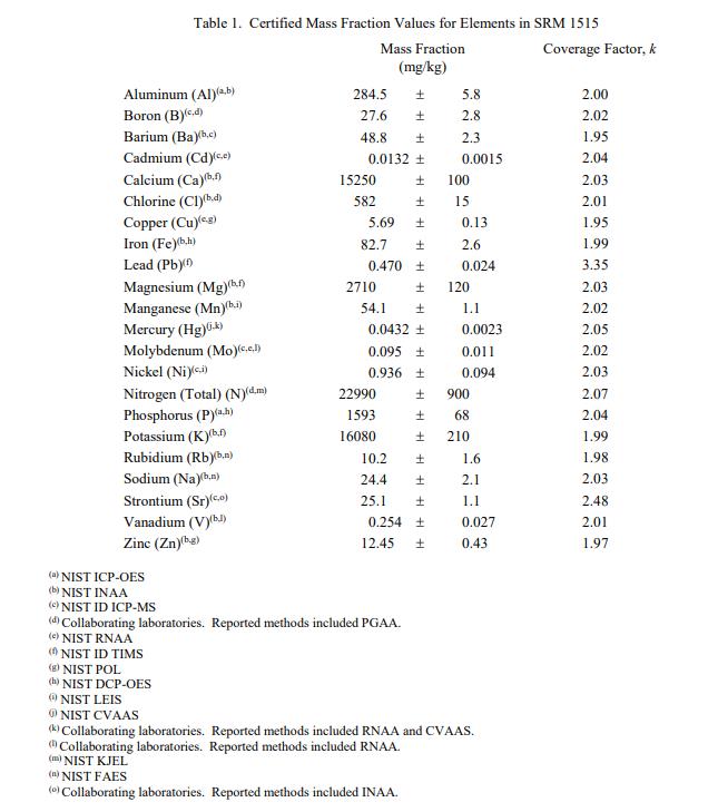 表 1 中提供了 SRM 1515 中元素的認(rèn)證質(zhì)量分?jǐn)?shù)值,以干質(zhì)量為基礎(chǔ)報(bào)告。NIST 認(rèn)證值是 NIST 對(duì)其準(zhǔn)確性有最高置信度的值或懷疑的偏倚來(lái)源已被調(diào)查或考慮[1]。價(jià)值分配分析由 NIST 和合作實(shí)驗(yàn)室進(jìn)行。認(rèn)證值是使用