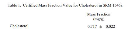 表 1 至表 3 提供了 SRM 1546a 中膽固醇、元素和維生素的認證質量分數值(按原樣報告)。 NIST 認證值是 NIST 具有最高置信度的值在其準確性方面,所有已知或可疑的偏見來源都已被考慮到[1]。價值分配分析由 NIST 和合作實驗室進行。認證值計算為 NIST 方法的平均值和合作實驗室提供的結果平均值的中位數或平均值(如果適用)。相關的不確定性以 95% 的置信水平表示 [2-4]。