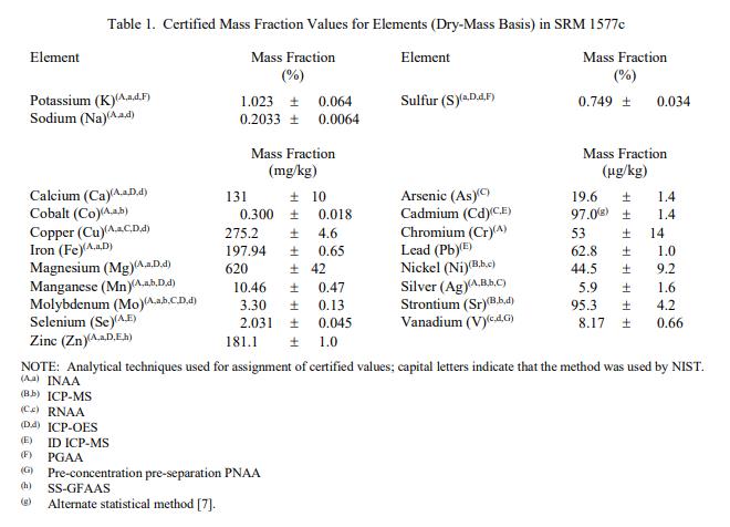 使用:在取出測試部分進行分析之前,應混合瓶子的內容物。對于元素分析,推薦的最小樣品量為 100 mg;見下文“同質性評估”。對于 25-羥基維生素.D3 的測定,推薦的最小樣品量為 2 g。 SRM 1577c 中元素的質量分數以干質量為基礎報告。建議在元素分析之前用 CaSO4(例如 Drierite)干燥至穩定質量(約 10 天)。