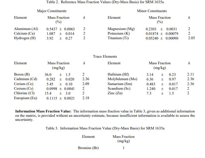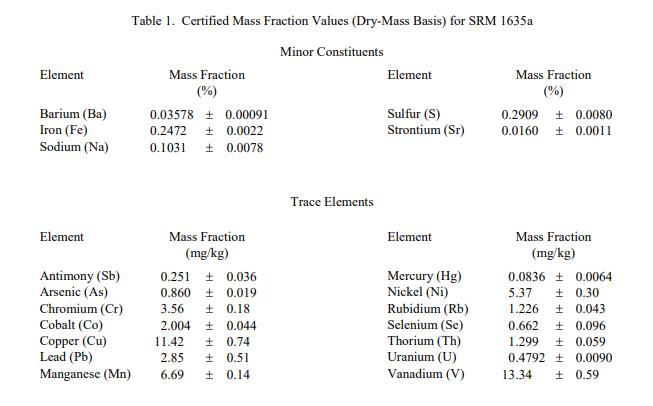 表 1 中提供了 19 種元素的認(rèn)證質(zhì)量分?jǐn)?shù) [1] 值,以干質(zhì)量表示。NIST 認(rèn)證值是 NIST 對其準(zhǔn)確性有最高置信度的值所有已知或可疑的偏見來源都已被調(diào)查或考慮 [2]。認(rèn)證值是對真實值的當(dāng)前最佳估計。