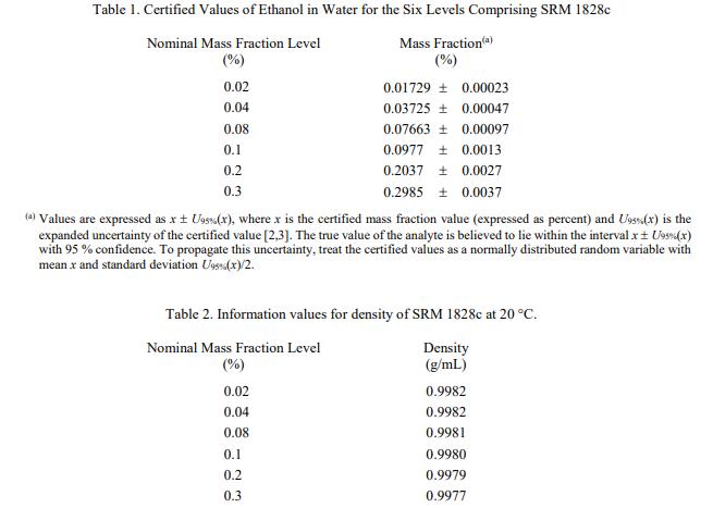 NIST SRM 1828c 乙醇-水溶液(標(biāo)準(zhǔn)品)的認(rèn)證在規(guī)定的測量不確定度內(nèi)有效期至 2037 年 4 月 30 日,前提是按照本證書中的說明處理和儲存 SRM(參見“操作、儲存和使用說明”) ”)。如果 SRM 損壞、污染或以其他方式修改,則認(rèn)證無效。
