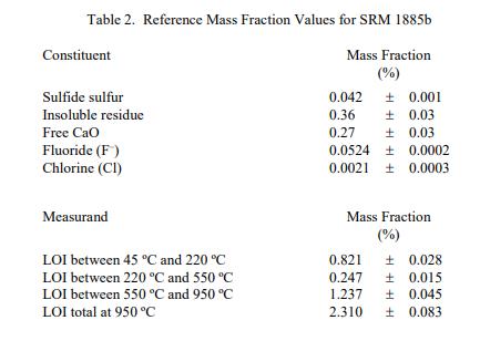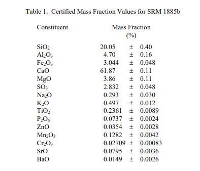 成分和燒失量 (LOI) 的參考值) 報告在表 2 中。NIST 參考值是未經(jīng)認(rèn)證的值,它是基于可用數(shù)據(jù)對真實(shí)值的最佳估計;但是,該值不符合 NIST 認(rèn)證標(biāo)準(zhǔn),并提供了相關(guān)的可能僅反映測量再現(xiàn)性的不確定性,可能不包括所有不確定性來源,或可能反映多種分析方法之間缺乏足夠的統(tǒng)計一致性 [3]。