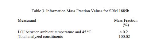 表 3 中報告了環(huán)境溫度和 45 oC 之間的 LOI 信息值和總分析成分。信息值被認(rèn)為是 SRM 用戶可能感興趣的值,但沒有足夠的信息可用于評估與值相關(guān)的不確定性 [3]。