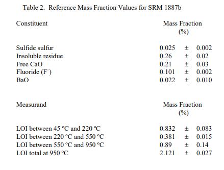 NIST SRM 1887b 硅酸鹽水泥(標準品)表 2 中報告了成分和燒失量 (LOI) 的參考值。NIST 參考值是未經認證的值,它是基于可用數據對真實值的最佳估計;然而,該值不符合 NIST 的認證標準,并且提供了相關的不確定性,這些不確定性可能僅反映測量再現性,可能不包括所有不確定性來源,或者可能反映多種分析方法之間缺乏足夠的統計一致性 [2]。