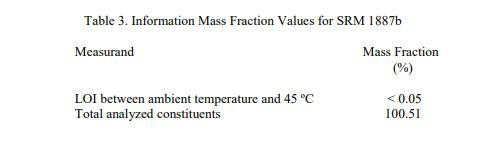 表 3 中報告了環境溫度和 45 oC 之間的 LOI 信息值和總分析成分。信息值被認為是 SRM 用戶可能感興趣的值,但沒有足夠的信息可用于評估與值相關的不確定性 [2]。