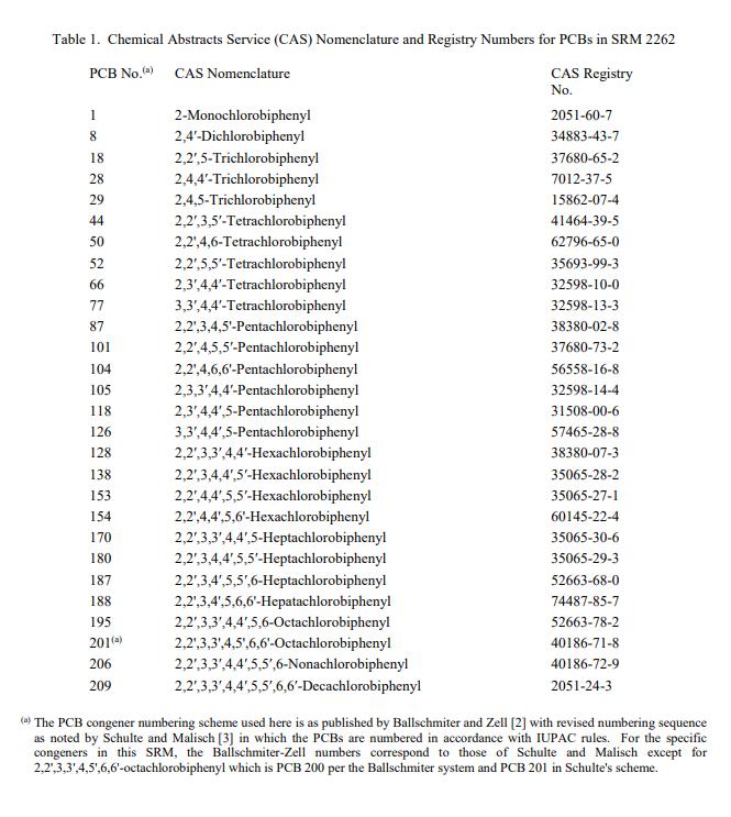 NIST SRM 2262 2,2,4-三甲基戊烷PCB同系物(標準品)是 28 種氯化聯苯同系物(也稱為多氯聯苯 (PCB) 同系物)在 2,2,4-三甲基戊烷(異辛烷)中的溶液。表 1 中列出了每種成分的化學文摘社 (CAS) 命名法和登記號。此 SRM 主要用于校準色譜儀器,用于確定經認證的化合物。一個 SRM 2262 單元由五個 2 mL 安瓿組成,每個安瓿含有大約 1.2 mL 溶液。
