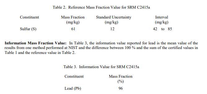 表 3 中報告了一個信息值,作為收到時的質(zhì)量分數(shù)。信息值被認為是 SRM 用戶可能感興趣的值,但沒有足夠的信息來評估與該值相關(guān)的不確定性 [2]。信息值不能用于建立計量溯源。