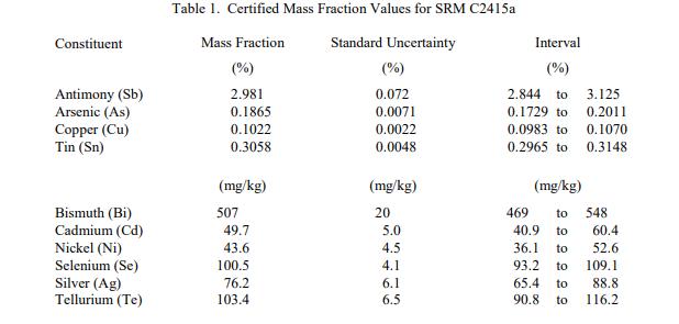SRM C2415a 成分的認證值在表 1 中報告為收到時的質(zhì)量分數(shù) [1]。 NIST 認證值是 NIST 對其準確性有最高置信度的值,因為所有已知或可疑的偏差來源都已調(diào)查或考慮在內(nèi) [2]。認證值是根據(jù) NIST 執(zhí)行的分析結(jié)果對真實值的當(dāng)前最佳估計。