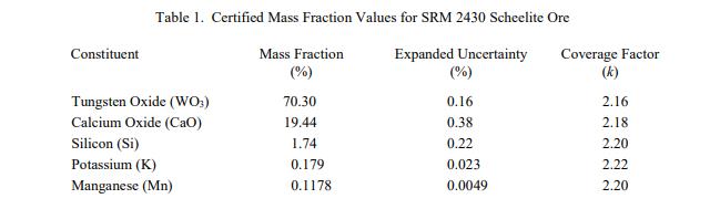 NIST SRM 2430白鎢礦(標(biāo)準(zhǔn)品) 的認(rèn)證在規(guī)定的測量不確定度范圍內(nèi)無限期有效,前提是按照本證書中給出的說明處理和存儲(chǔ) SRM(請參閱“存儲(chǔ)和使用說明”)。因此,此 SRM 的定期重新校準(zhǔn)或重新認(rèn)證不需要。如果 SRM 損壞、污染或以其他方式修改,則認(rèn)證無效。