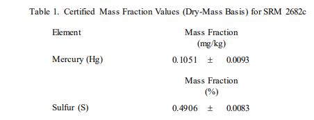 表 1 中提供了汞和硫的認(rèn)證值,以基于干質(zhì)量的質(zhì)量分?jǐn)?shù) [1] 表示。NIST 認(rèn)證值是 NIST 對(duì)其準(zhǔn)確性有最高置信度的值所有已知或可疑的偏差來源都已被調(diào)查或考慮 [2]。認(rèn)證值是對(duì)真實(shí)值的當(dāng)前最佳估計(jì)。