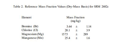 表 2 中提供了溴、氯、鎂和錳的參考值,以基于干質(zhì)量的質(zhì)量分?jǐn)?shù) [1] 表示。參考值是最佳估計(jì)值的非認(rèn)證值的真實(shí)價(jià)值;但是,該值不符合 NIST 的認(rèn)證標(biāo)準(zhǔn),并且提供了相關(guān)的不確定性,該不確定性可能僅反映測(cè)量精度,可能不包括所有不確定性來源 [2]。