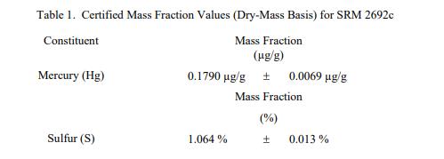 表 1 中提供了硫和汞的認(rèn)證值,以基于干質(zhì)量的質(zhì)量分?jǐn)?shù) [1] 表示。NIST 認(rèn)證值是 NIST 對(duì)其準(zhǔn)確性有最高置信度的值所有已知或可疑的偏差來(lái)源都已被調(diào)查或考慮 [2]。認(rèn)證值是對(duì)真實(shí)值的當(dāng)前最佳估計(jì)。硫的認(rèn)證值基于加權(quán)最小