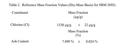 NIST SRM 2692c煙煤(標(biāo)準(zhǔn)品)表 2 中提供了氯和灰分含量 [6,7] 的參考值,以基于干質(zhì)量的質(zhì)量分?jǐn)?shù) [1] 表示。氯的參考值基于使用NIST 技術(shù)。灰分含量的參考值基于 CANSPEX 計(jì)劃與 NIST 合作提供的數(shù)據(jù)。參考值是非認(rèn)證值,是對(duì)真實(shí)值的當(dāng)前最佳估計(jì);但是,這些值不符合 NIST 的認(rèn)證標(biāo)準(zhǔn),并且提供了相關(guān)的不確定性,這些不確定性可能僅反映測(cè)量精度,可能不包括所有不確定性來(lái)源 [2]。每個(gè)值列出的不確定度是基于 95% 置信區(qū)間的擴(kuò)展不確定度,并根據(jù)ISO/JCGM 指南 [4,5] 中的方法。