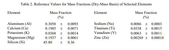 表 2 提供了基于干質量的鋁、鈣、鉀、鎂、鈉、硅、鈦、釩和鋅的參考質量分數值。參考值是非認證值,是對鋁、鈣、鉀、鎂、鈉、硅、鈦、釩和鋅的最佳估計。真實價值;但是,這些值不符合 NIST 的認證標準,并且提供了相關的不確定性,這些不確定性可能僅反映測量精度,可能不包括所有不確定性來源,或者可能反映多種分析方法之間缺乏足夠的統計一致性 [1]。表 2 中的被測量是通過所示方法確定的元素的質量分數。計量溯源性是質量的 SI 單位,以質量分數表示。