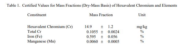 表 1 提供了 SRM 2700 中基于干質量的六價鉻、總鉻、鐵和錳的認證質量分數。認證值基于經過嚴格評估的獨立分析技術。 NIST 認證值是 NIST 對其準確性具有最高置信度的值,因為所有已知或可疑的偏差來源都已被調查或考慮在內 [1]。被測量是表 1 中報告的元素的質量分數。計量溯源性為質量的 SI 單位,以質量分數表示。