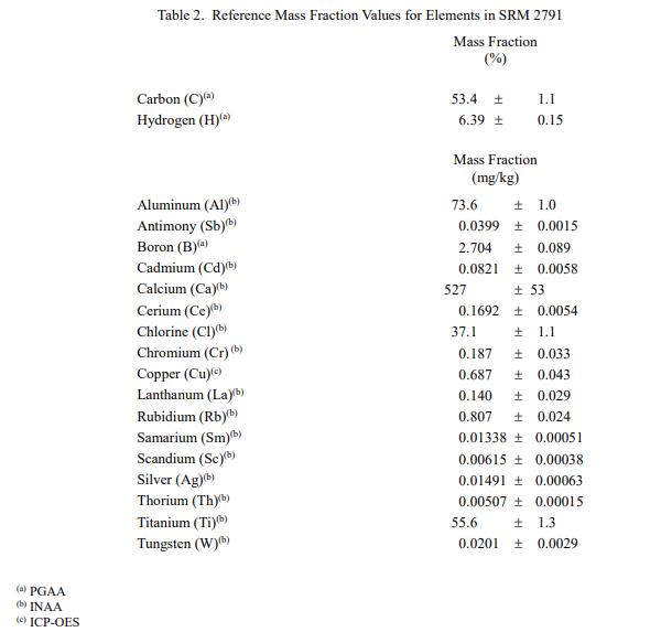 表 2 和表 3 中提供了其他元素的參考質(zhì)量分數(shù)值,以干質(zhì)量為基礎(chǔ)報告,以及 SRM 2791 中的灰分。NIST 參考質(zhì)量分數(shù)值是最佳估計值的非認證值基于可用數(shù)據(jù)的真實值;但是,這些值不符合 NIST認證標準 [1] 提供的不確定度可能僅反映測量再現(xiàn)性,可能不包括所有不確定性來源,或者可能反映多種分析方法之間缺乏足夠的統(tǒng)計一致性。參考質(zhì)量分數(shù)值來自 NIST 報告的結(jié)果。