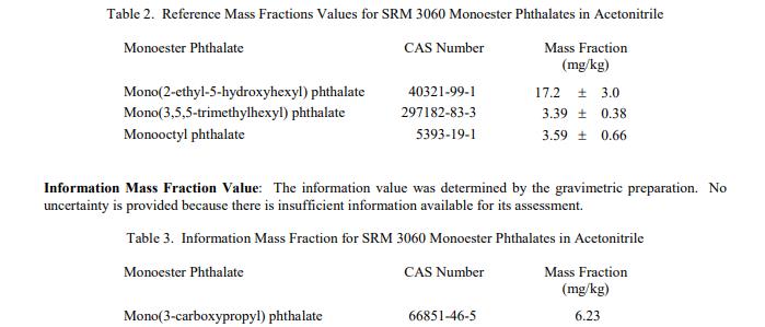 表 2 中列出的鄰苯二甲酸單酯的參考質量分數值是基于從溶液的重量法制備和使用液相色譜法確定的分析結果獲得的結果。參考值是對真實值的最佳估計值;然而,這些值不符合 NIST 認證標準,并且提供了相關的不確定性,這些不確定性可能僅反映測量精度,可能不包括所有不確定性來源,或者可能反映多種分析方法之間缺乏足夠的統計一致性 [1]。