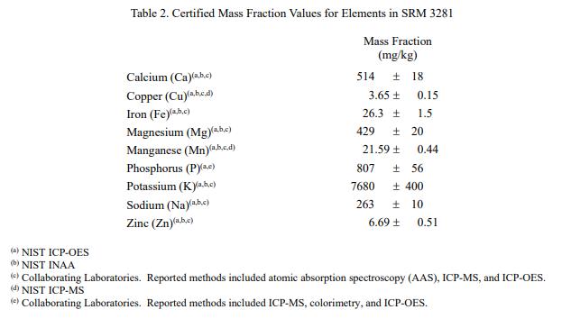 表 1 和表 2 中提供了以干質量為基礎報告的奎尼酸和元素的認證質量分數值。NIST 認證值是 NIST 對其準確性有最高置信度的值所有已知或可疑的偏差來源都已被考慮在內 [1]。價值分配分析由 NIST 和合作實驗室進行。認證值計算為