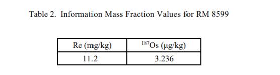 表 2 中提供的 Re 和 187O 的信息值是未經認證的值,沒有報告不確定性。信息值 [1] 被認為是 RM 用戶感興趣的值,但沒有足夠的信息來評估與該值相關的不確定性。