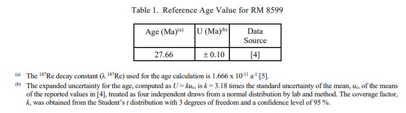 表 1 中列出的參考值是通過在兩個專家實驗室使用固體源負熱電離質譜儀結合使用兩種不同的混合 Re-Os 加標的 47 次獨立同位素稀釋測量的數據獲得的。實驗程序和結果的詳細信息發表在 [4] 中。沒有發現同位素異質性的證據,并且年齡的擴展不確定性可以被視為反映隨機測量誤差以及實驗室和方法之間的隨機變化。