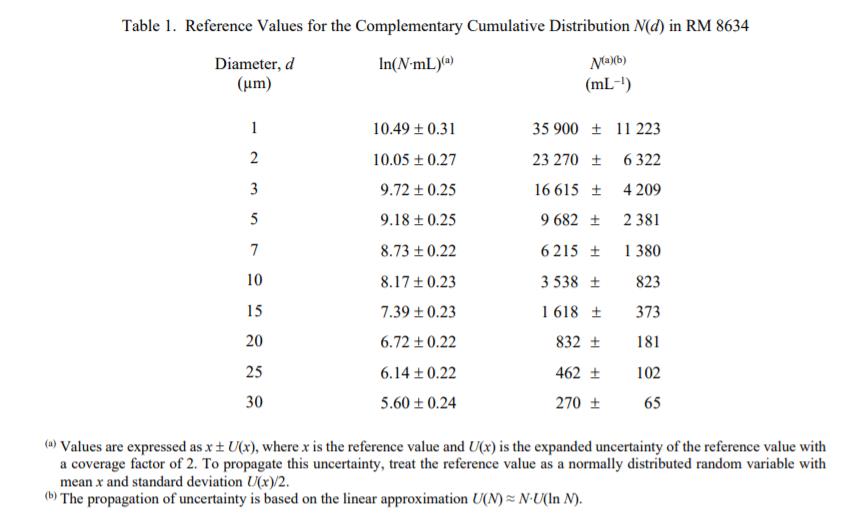 NIST 參考值是未經(jīng)認證的值,它是基于可用數(shù)據(jù)對真實值的最佳估計;然而,該值不符合 NIST 的認證標準,并且提供了相關(guān)的不確定性,可能僅反映測量精度,可能不包括所有不確定性來源,或者可能反映多種分析方法之間缺乏足夠的統(tǒng)計一致性 [1,2 ]。表 1 和表 2 中提供了粒度分布和形態(tài)參考值。這些值在計量上可溯源至使用的測量方法和校準程序